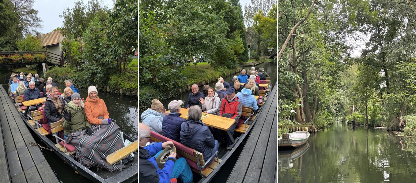 Hier erwartete uns schon die „Burger Rumpel-Guste“ (Kleinbahn) die uns nach einer halbstündigen Rundfahrt am Bootshaus Rehnus, zu einer Kahntour, absetzte. Eingehüllt in Jacken und Decken, den Regenschirm griffbereit, fuhren wir 2 Stunden durch die Kanäle, informiert mit vielen Details durch den Kahnführer. Danach eine kleine Stärkung mit einer Plinse (Hefegebäck) und einem Heissgetränk, wahlweise auch (temperaturgerecht!) ein Glühwein. Nach der Pause eine zweite kürzere Tour, die einige Teilnehmer lieber am Kaminofen des Bootshauses verbrachten. Das Abendessen, traditionell, Gurkensalat, Quark mit Pellkartoffeln. Das besondere ist der Schuss Leinöl im Quark.