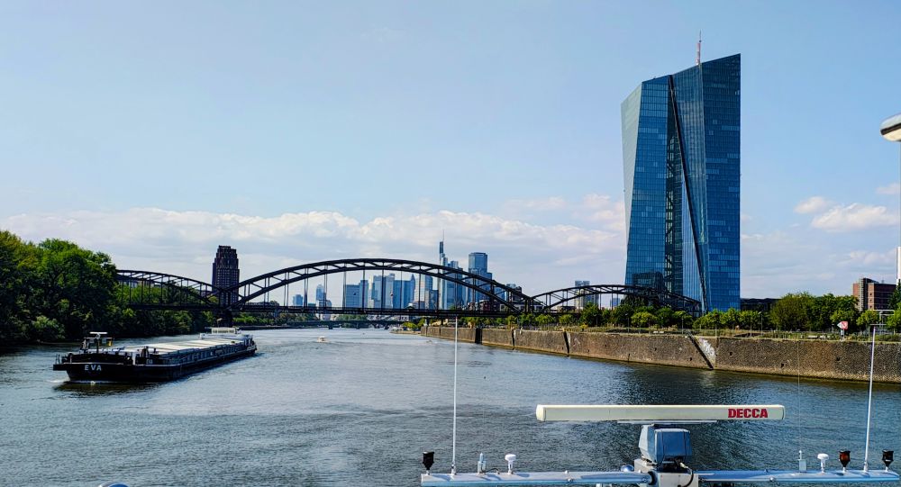 Die Fahrt ging dann zurück zum Eisernen Steg. Dort blieben wir aber an Bord, um mit dem Schiff weiter nach Osten zu fahren. Wieder unter mehreren Brücken durch, vorbei an der Dreikönigskirche und dem Main Plaza auf der Südseite sowie dem Dom und der Europäischen Zentralbank (EZB) auf der Nordseite erreichten wir den Osthafen. An der Schleuse Offenbach machte das Schiff kehrt und fuhr zurück zum Eisernen Steg.