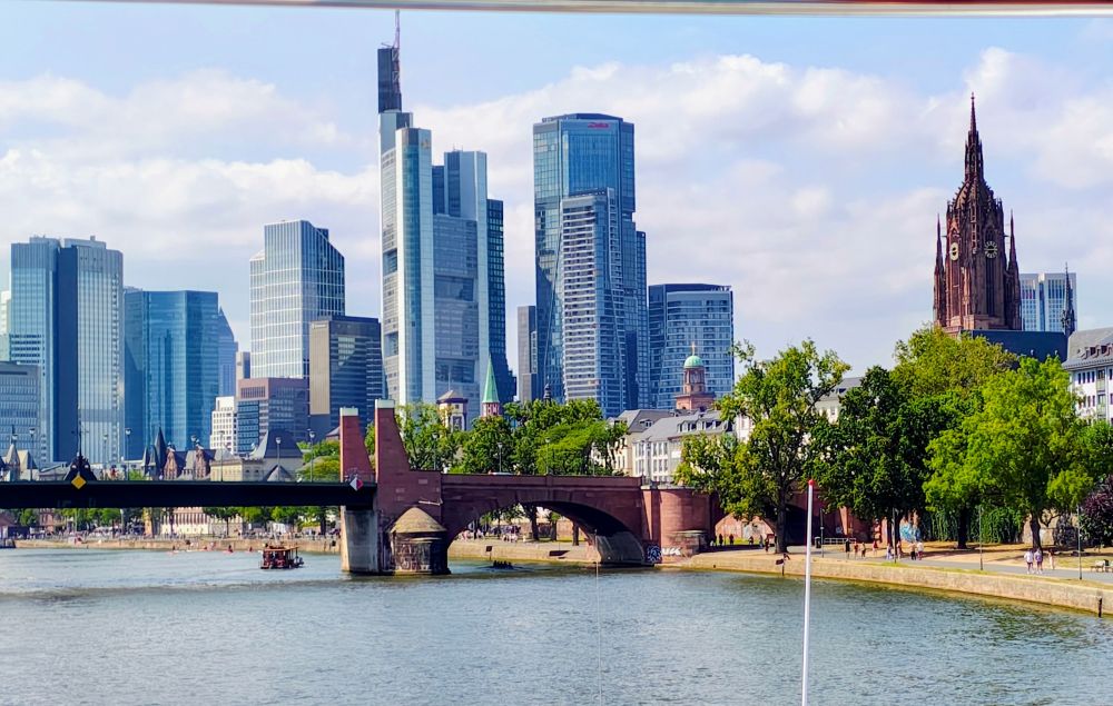 Auf beiden Touren - sowohl nach Westen als auch nach Osten – hatten wir immer wieder einen Blick auf die Hochhauskulisse von Frankfurt und konnten die Skyline auf der Nordseite des Mains aus verschiedenen Perspektiven bewundern. Im Laufe der letzten 30 Jahre wurde sie ja zu einem Wahrzeichen der Stadt mit mehr als 40 Gebäuden auf engstem Raum, die eine Höhe von mehr als 100 Metern erreichen, u. a. Commerzbank Tower, Messeturm, Main Tower, Tower 185, One, Omniturm, Trianon.