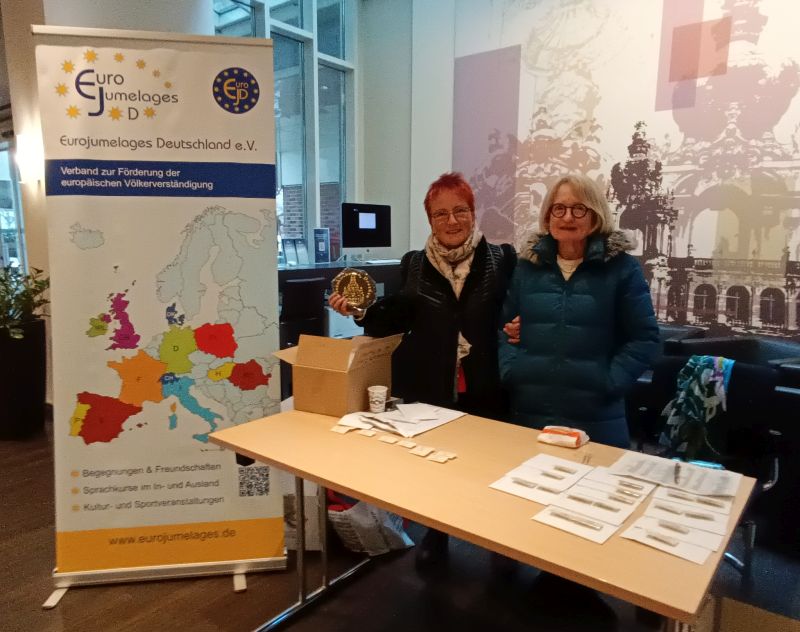 mit einem Bild der Frauenkirche aus Zuckerguss), mit Infomaterial von Dresden und Stadtplänen. Wer schon frühzeitig da war, konnte schon erste Erkundungen von Dresden machen. Um 18:00 Uhr trafen wir uns dann alle im Restaurant des IBIS-Hotels zum Abendessen. Wir wurden von unserer Bundesvorsitzenden Michaela Alber begrüßt, die auch Grußworte von Peter Backes, dem Vorsitzenden der Eurojumelages übermittelte.